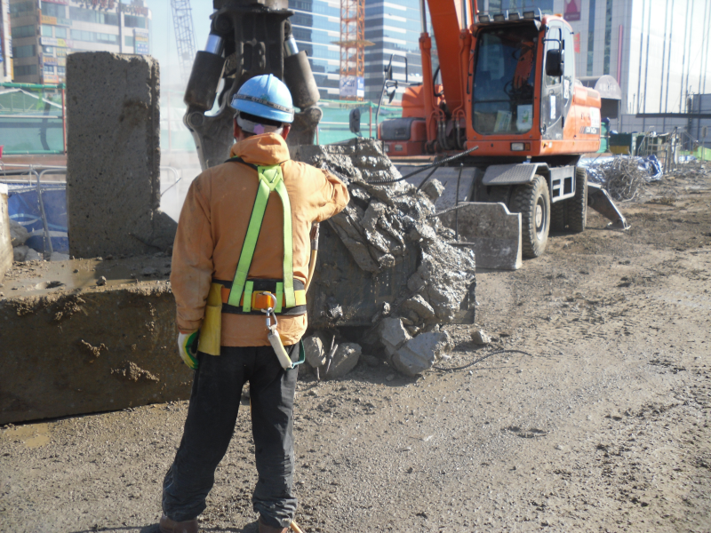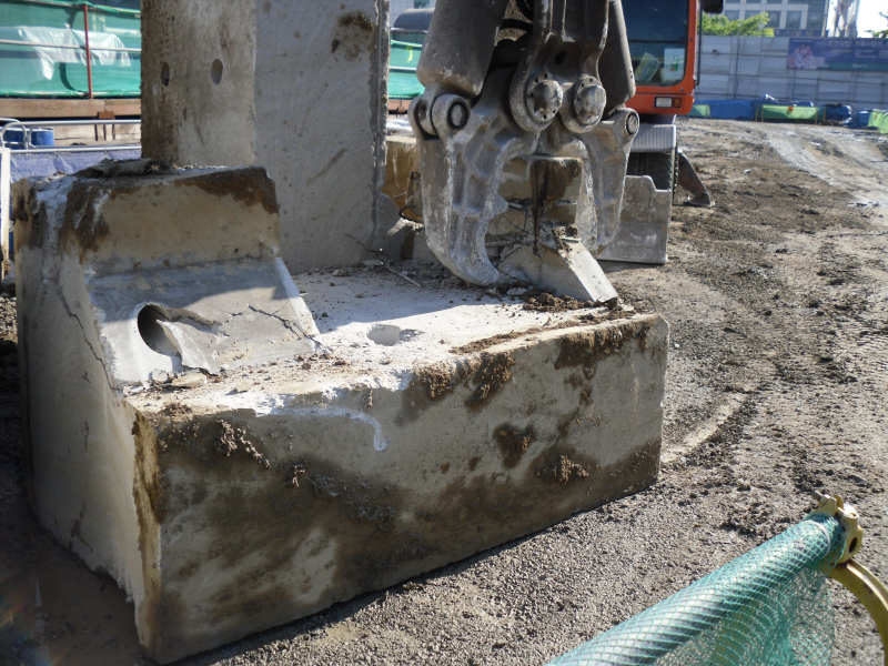 다이야몬드 와이어쏘 G - 150 으로 콘크리트 구조물 커팅후 인양된 부재 굴삭기 크라샤로 파쇄하는 작업